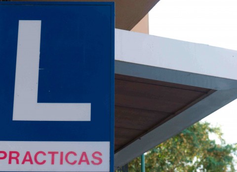 En la oscuridad de la noche, el rótulo iluminado de la autoescuela El Torcal se refleja en el retrovisor de un coche y es lo único que le proporciona luz directa a la imagen, contrastando así con la penumbra del entorno. El espejo retrovisor enmarca la escena, dando una sensación de perspectiva y profundidad.