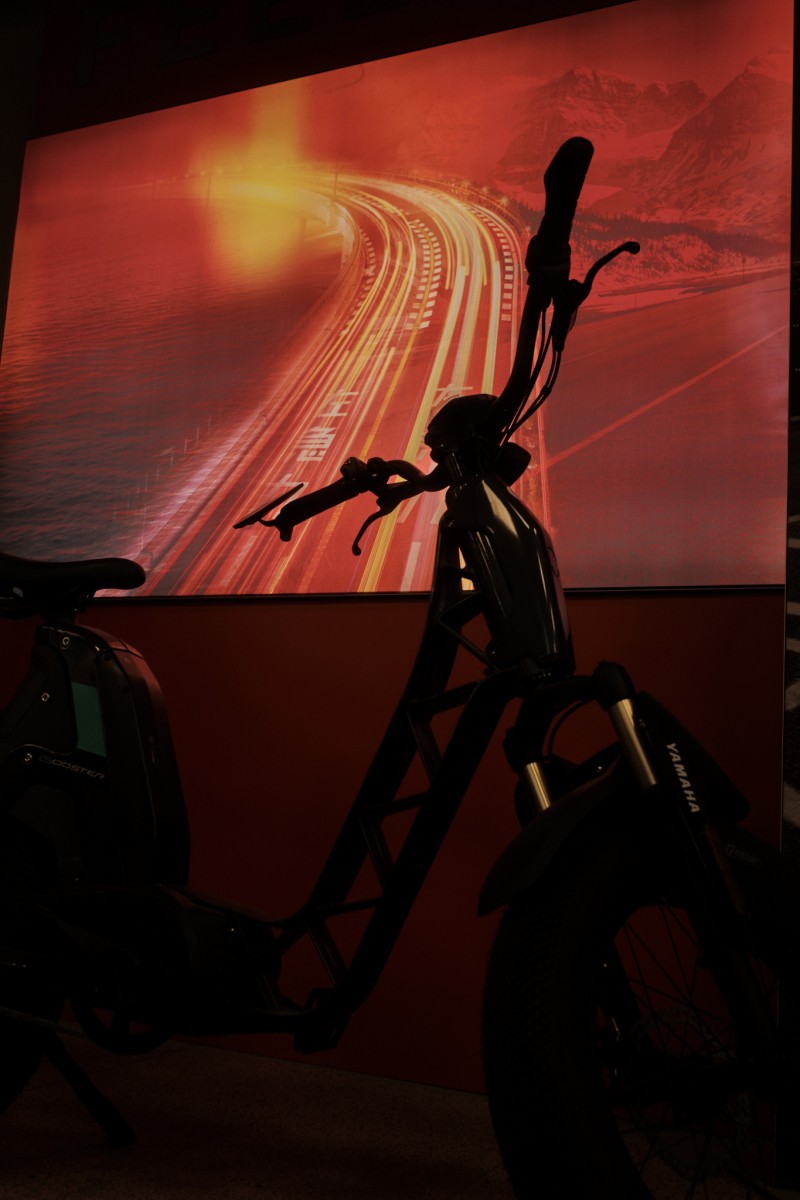 La silueta negra de una bicicleta frente al flujo rojo de la ciudad en movimiento.