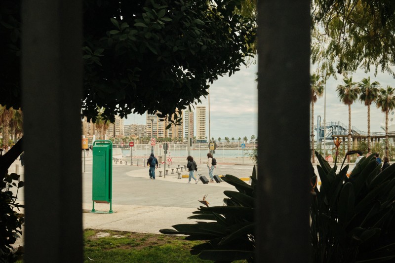 Entre árboles y columnas aparece el paseo marítimo de Málaga, un espacio donde la ciudad se abre al mar.